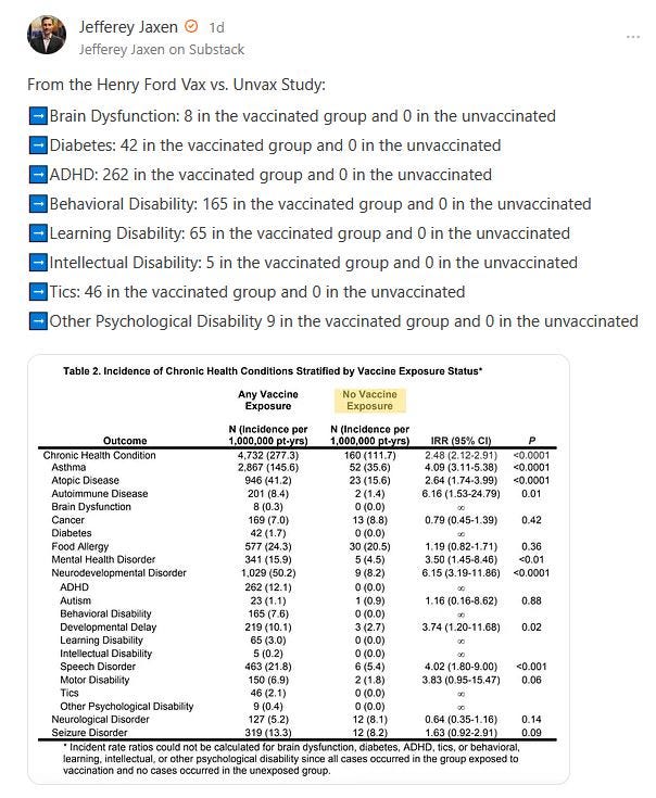 “Henry Ford vaxxed vs. unvaxxed study found vaccinated kids had 453% more neurodevelopmental disorders — 57% were chronically ill after 10 years.” (2000 - 2016)